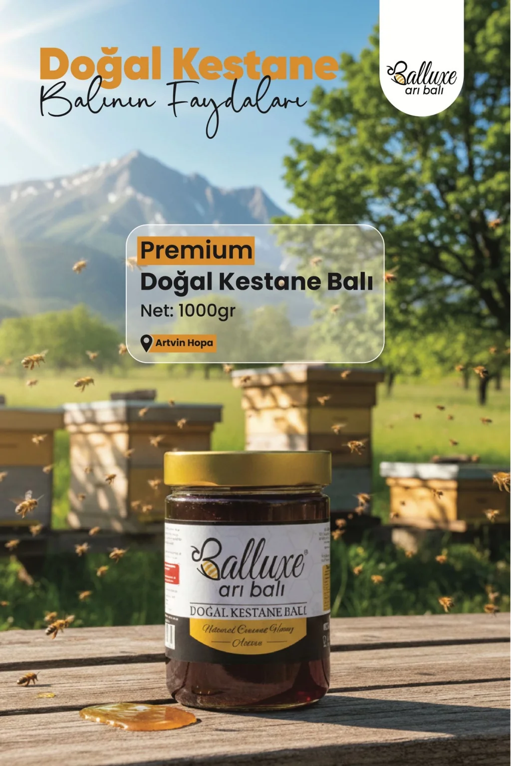 BALLUXE Kestane balı, Artvin Hopa'da ki köyümüzdeki kendi çiftliğimizde ,arıların Mart ayından Ağustos ayı sonuna kadar Zengin ve kimyasal kirliliği olmayan floramızdan topladıkları kestane nektarı ağırlıklı özel bir aromaya sahip, geleneksel sağım takvimine uyulmuş ,2024 sezonuna ait özel bir baldır.