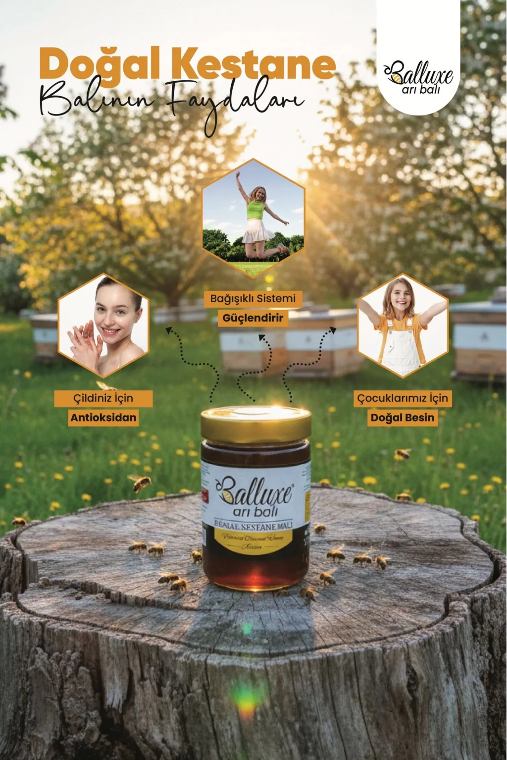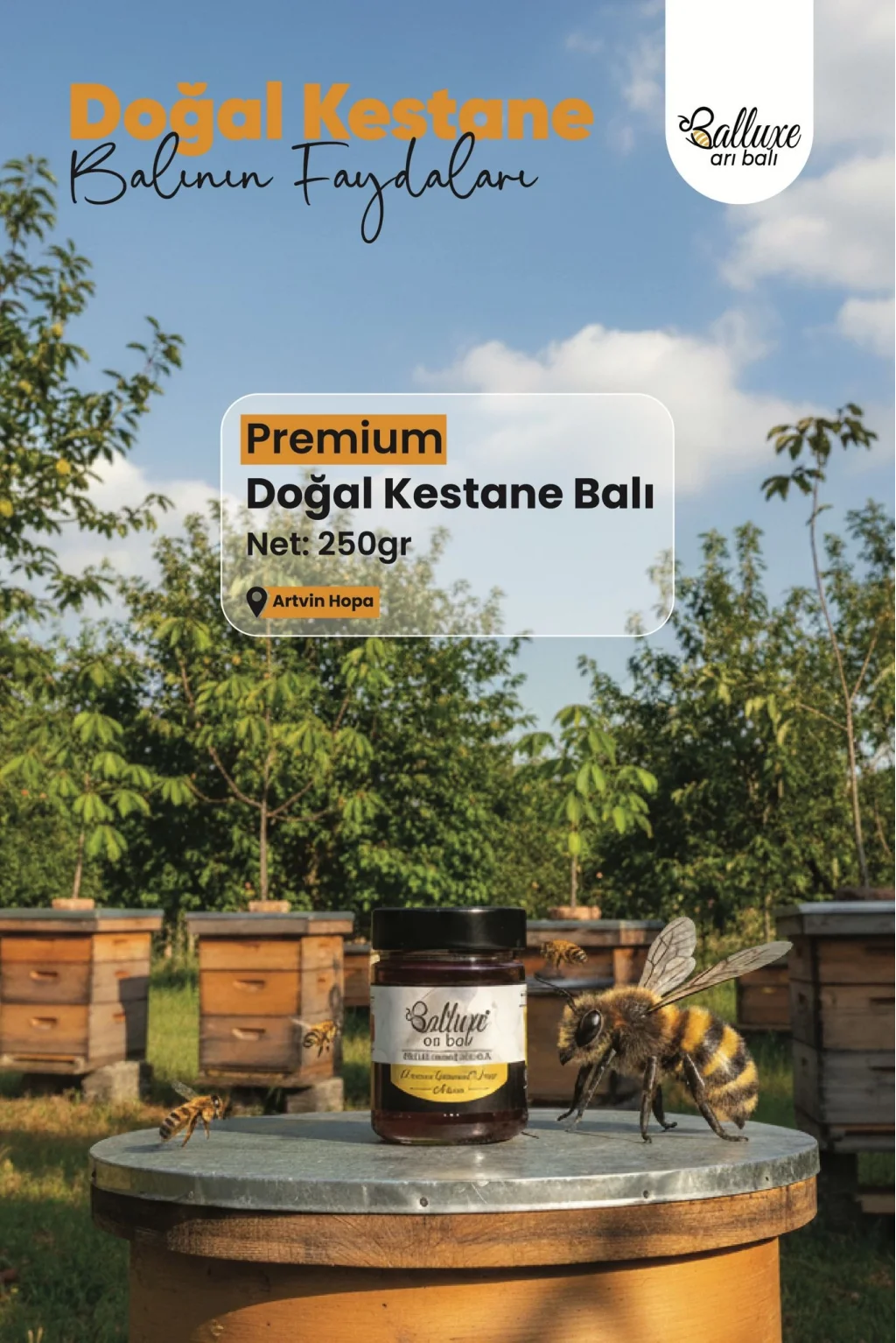 BALLUXE Kestane balı, Artvin Hopa'da ki köyümüzdeki kendi çiftliğimizde ,arıların Mart ayından Ağustos ayı sonuna kadar Zengin ve kimyasal kirliliği olmayan floramızdan topladıkları kestane nektarı ağırlıklı özel bir aromaya sahip, geleneksel sağım takvimine uyulmuş ,2025 sezonuna ait özel bir baldır.