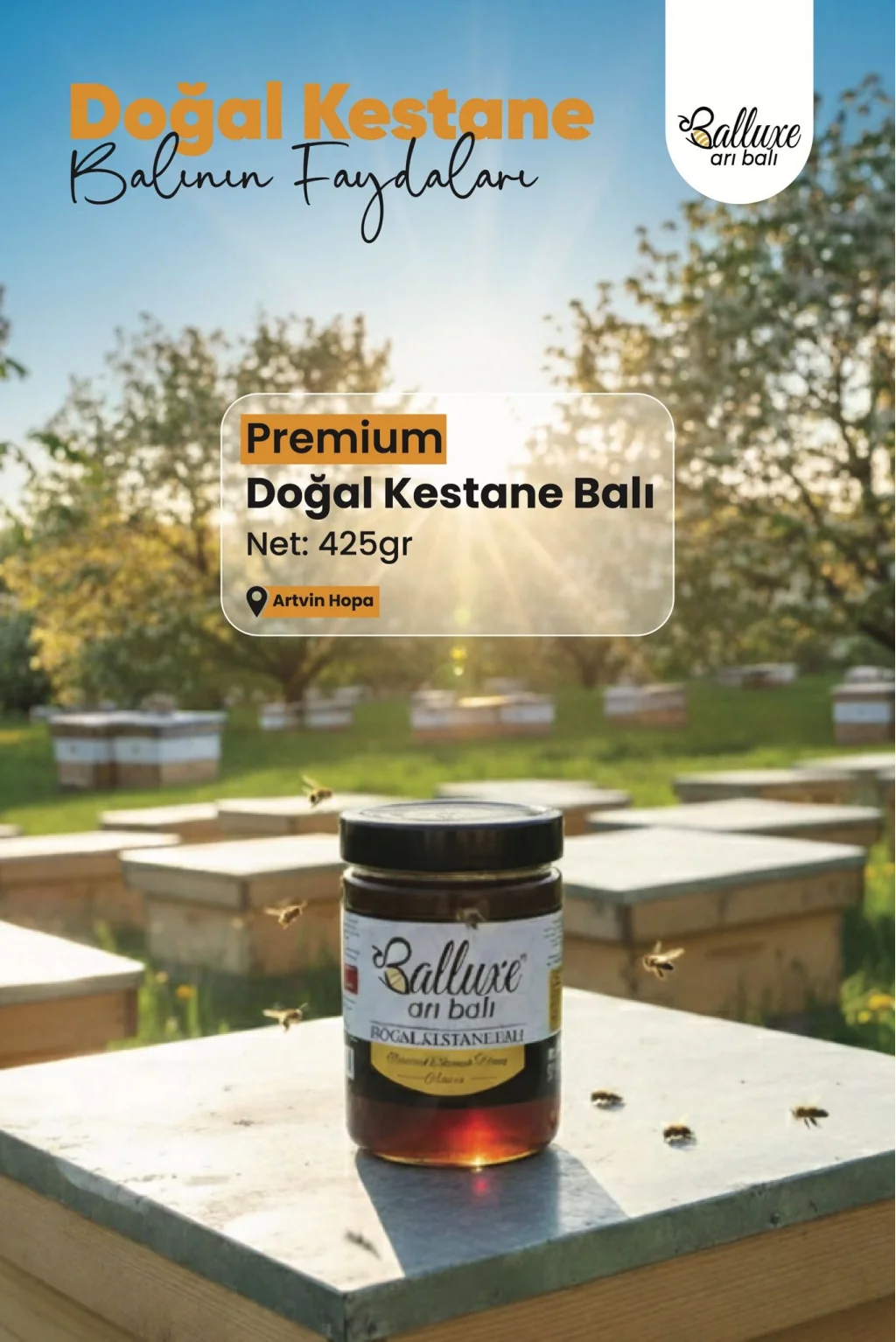 BALLUXE Kestane balı, Artvin Hopa'da ki köyümüzdeki kendi çiftliğimizde ,arıların Mart ayından Ağustos ayı sonuna kadar Zengin ve kimyasal kirliliği olmayan floramızdan topladıkları kestane nektarı ağırlıklı özel bir aromaya sahip, geleneksel sağım takvimine uyulmuş ,2025 sezonuna ait özel bir baldır.